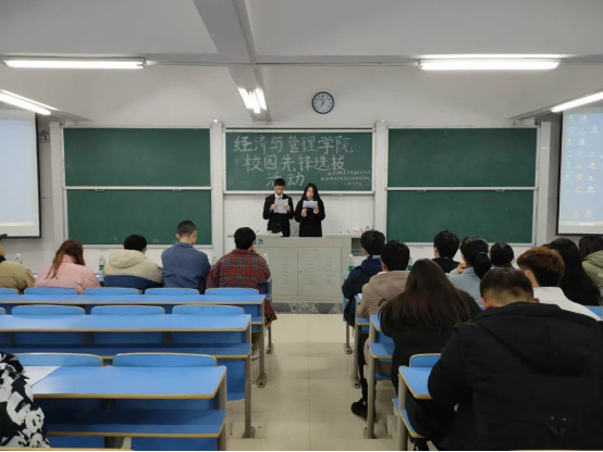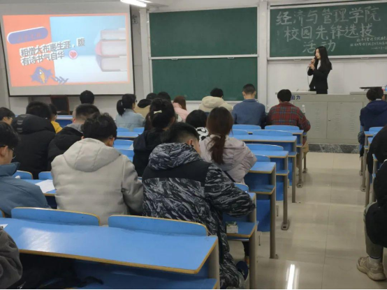 2020年3月3日19时,经济与管理学院于明德楼南栋T3教室举办“校园先锋”选拔比赛。此次活动旨在引导广大学生见贤思齐、净化心灵、提升境界。通过候选人的自我介绍和先进事迹帮助大学生提高思想觉悟和自身素质。