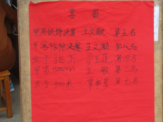 10月28日上午8:00,进行了甲组女子跳高决赛,我系罗玉莲同学取得了第四名的好成绩。在男子铁饼决赛中,我系王文灏同学取得了第5名的优秀成绩,同时在男子标枪决赛中,他也取得了第8名的好成绩;在男子1500米中,王敏同学取得第二名的好成绩,在男子5000米中,王敏同学更是获得了第一名的好成绩;在女子400米覃事景同学取得了第七名的好成绩;刘振同学获得男子跳高第三名的好成绩!