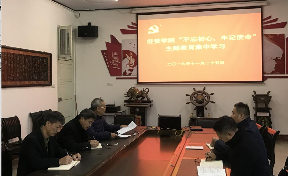 11月25日上午,经济与管理学院中心组在经济与管理学院学院党员活动室召开了“不忘初心,牢记使命”主题教育集中学习。总支书记黎昀同志带领学院中心组成员学习了《中国共产党第十九届中央委员会第四次全体会议公报》和《中共中央关于坚持和完善中国特色社会主义制度推进国家治理体系和治理能力现代化若干重大问题的决定》。