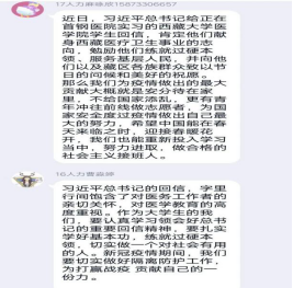 随后,参加活动的每位党员同志都以文字的形式在群里发表自己的感想及看法。有同志表示作为党员,在面对国难来临之际,更加要扛起自己肩上的一份责任,即使没有机会抗争在前线,但也应该用尽自身力量保障后方。有同志表示在这次疫情面前,先要保证自己及家人的安全防护措施到位,不拖国家及社会的后腿,其次也要利用可宣传的媒介帮助周边社区人员树立安全防护意识,用自己的力量稳定后方。有同志观看完视频后,表示非常佩服那17名同学的精神,立志要向他们学习,希望自己在日后珍惜学习时光,练就过硬本领,为党、国家、人民奉献自己。