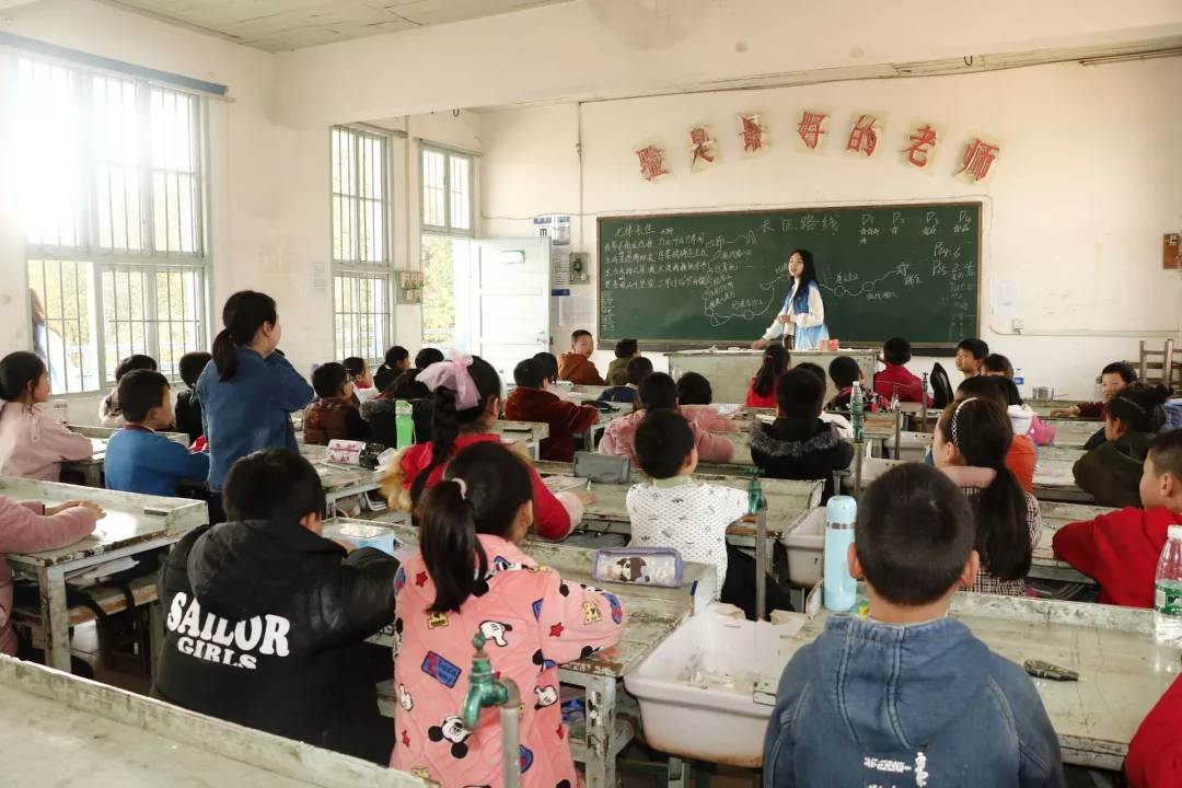 接下来让我们一起来看看刘心岳支教团队,她们负责的班级是四年级一班,在简单的自我介绍下,她们开始了她们的小课堂,首先她们通过一张图片吸引了小朋友们的眼球,小朋友们都十分好奇这些大姐姐们要给他们带来什么样的故事呢!他们带着疑问认真的听咱们志愿者分享长征途中一个老班长的故事——《金色的鱼钩》,故事分享完小朋友都十分积极的回答问题,课堂学习氛围十分浓烈,这也为接下来的课堂分享打下了良好的基础。接着我们的志愿者为孩子们诵读长征诗《七律长征》,这首诗是对上面故事的总结,这不是一枚普通的鱼钩,万分沉重。这鱼钩,是一种深深地怀念,还是一份革命的力量,更是对一代代享受着美好生活的人们的教育呀!在长征途中有多少这样可歌可泣的英雄,正因为有了他们,才有了我们现在美好的今天!