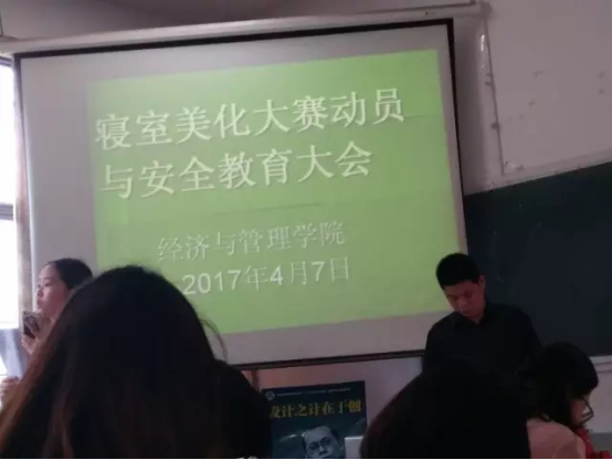 2017年4月7日中午,伴随着明媚的春光,经济与管理学院党委副书记马骥以及各级辅导员组织召开寝室美化大赛动员与安全教育大会。参加会议的有各级各班班长,团支书,劳动委员以及各部门部长。